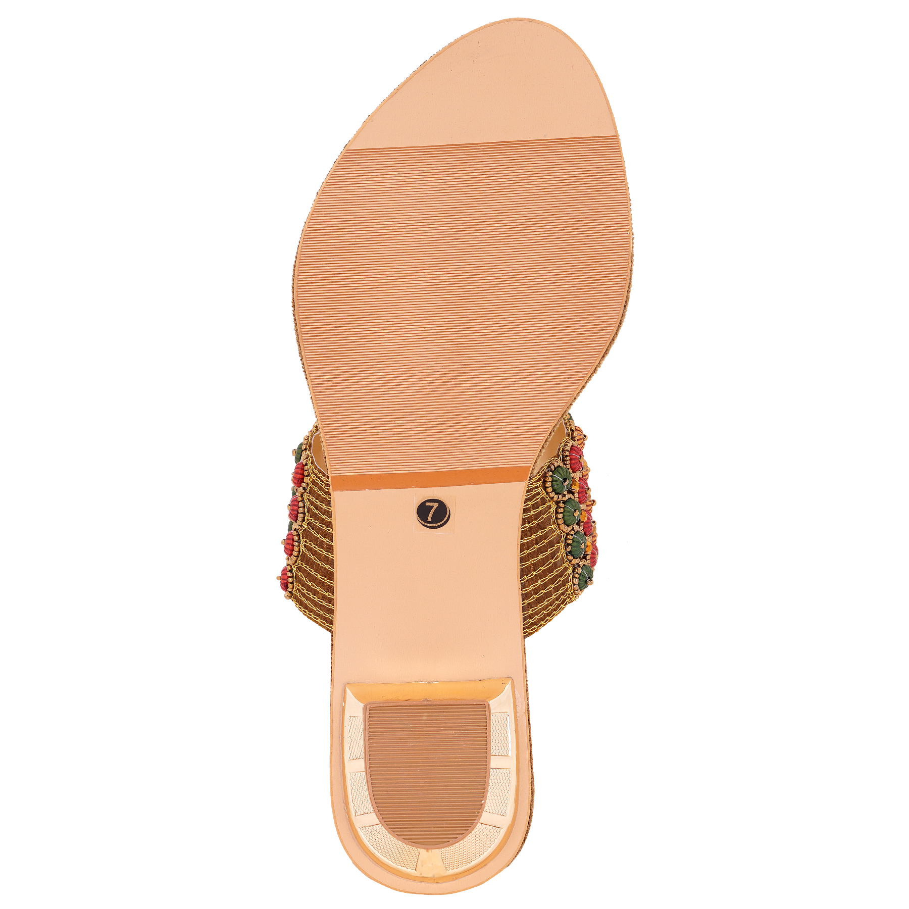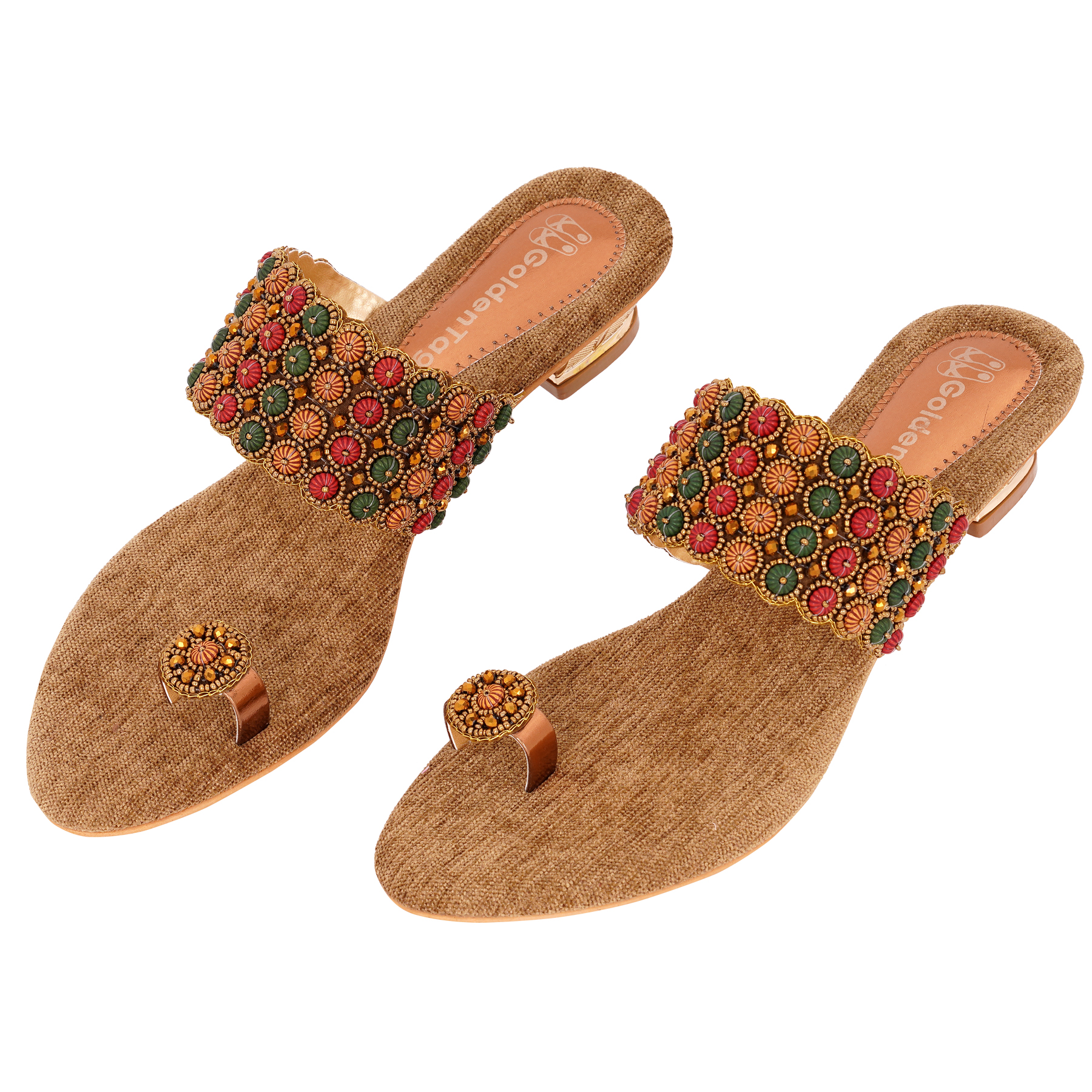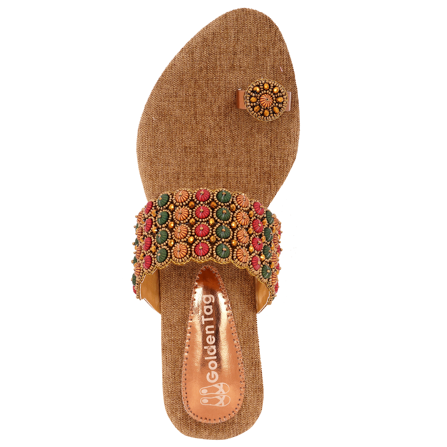 Experience Comfort, Support, and Style with Handcrafted "Golden Tag" Toe-Ring Sandals Step into a world of comfort, support, and style with these beautifully handcrafted toe-ring sandals from "Golden Tag." Designed with a unique blend of traditional craftsmanship and modern comfort features, these sandals are perfect for adding a touch of elegance to your everyday look or special occasions. Key Features: Textured Beige Material: The upper strap and sole are crafted from a textured beige material, adding a touch of natural elegance. Intricate Floral Beadwork and Zari Accents: The upper strap and toe ring are adorned with colorful beads arranged in floral patterns, along with delicate zari work, showcasing meticulous craftsmanship. Saro Sheet Sole: The durable and stable saro sheet sole provides excellent support and longevity. 1-Inch Heel for Support and Stability: The 1-inch heel is designed to provide better support and stability, enhancing comfort with every step. 5mm EVA Insole: Enjoy all-day comfort with the 5mm high-quality EVA insole, providing superior cushioning and support. Precise Handcrafted Fit: Each pair is precisely handmade, ensuring a comfortable and snug fit. Toe-Ring Design: The classic toe-ring design adds a touch of traditional Indian style. Perfect For: Everyday wear, casual outings, festivals, and special occasions. Adding a touch of ethnic-inspired style to your wardrobe. Those seeking comfortable, supportive, and stylish handcrafted footwear. Step out in confidence and comfort with these handcrafted "Golden Tag" toe-ring sandals. Experience the perfect blend of support, durability, stability and elegance with every step you